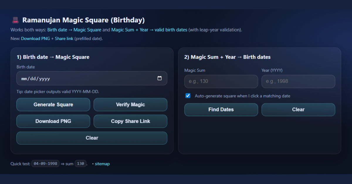 Generate a Ramanujan-style 4×4 birthday magic square instantly, reverse-search dates from magic sum + year, download PNG, and share your result beautifully.